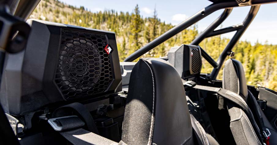 - Factory Tuned & Integrated Rockford Fosgate Stage 4 Audio System with RIDE COMMAND Source Unit. Includes (2) 100 watt 1-inch tweeters, (2) 100 watt 6.5-inch component front speakers, (2) 100 watt 6.5-inch coaxial rear speakers, (1) 400 watt 4-channel amplifier, and (1) 10-inch subwoofer with an integrated 400 watt subwoofer amplifier. *Audio System is IPX7 and IPX9K water immersion tested to withstand the wet elements.